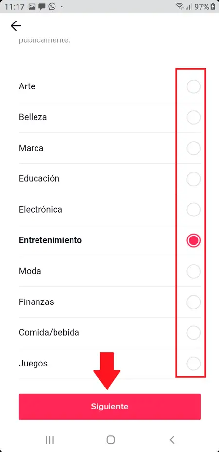 - Dans le nouvel écran qui y apparaît vous devez sélectionner les catégories qui décrivent votre compte, une fois sélectionné cliquez sur «Suivant».