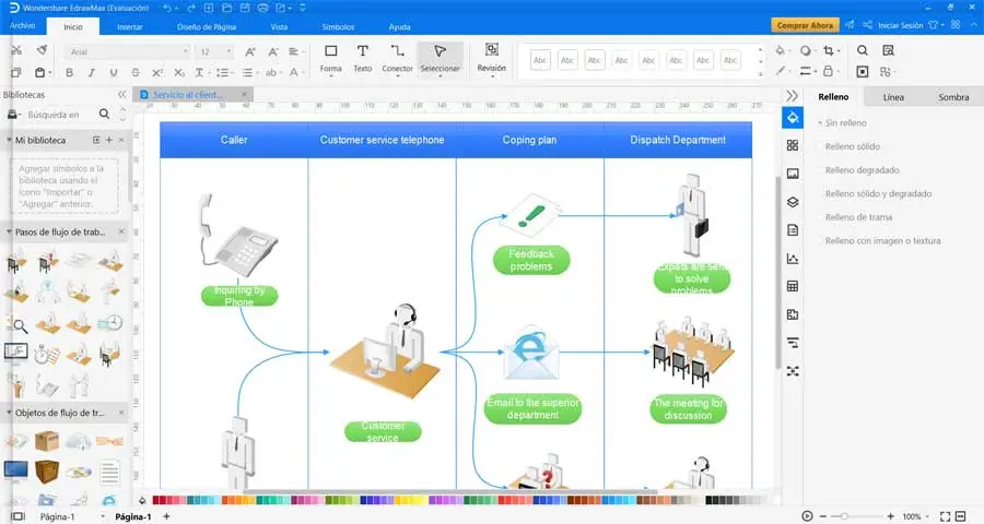 Ce sera alors, une fois le modèle qui sert de base au projet chargé , que notre travail commencera réellement. Mais bien sûr, comme nous le voyons, EdrawMax en a fait une bonne partie pour nous à l’avance. Maintenant, nous devons commencer par les tâches d’adaptation et de personnalisation du diagramme que nous avons à l’écran. Pour cela, le programme nous présente un grand nombre de fonctions et d’outils, dont beaucoup sont axés sur le design.