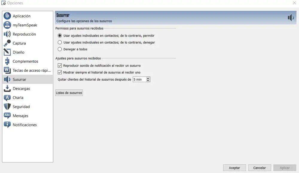 Desde esta sección lo que hacemos es personalizar la función de susurros al comunicarnos de esta manera con otros usuarios del canal. Por ejemplo podemos personalizar el sistema de notificaciones de los que recibimos nosotros o el tiempo que estos elementos estarán visibles en pantalla.
