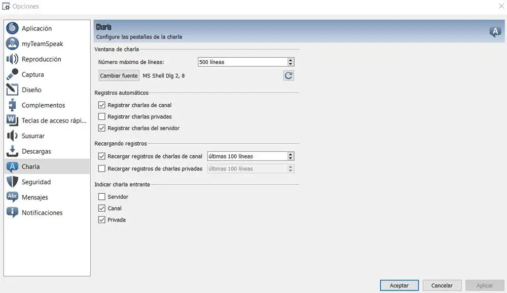 Aunque podemos hacerlo vía voz, el texto también es un elemento muy usado en este cliente para comunicarnos con el resto de usuarios del canal. Por tanto el poder personalizar el funcionamiento de todo ello también nos será muy útil en la mayoría de las ocasiones. Esto es algo que precisamente llevamos a cabo desde este apartado en concreto. Aquí veremos parámetros que nos permiten guardar, o no, las charlas tanto públicas como privadas, o el número de líneas de texto que deseamos tener a la vista.