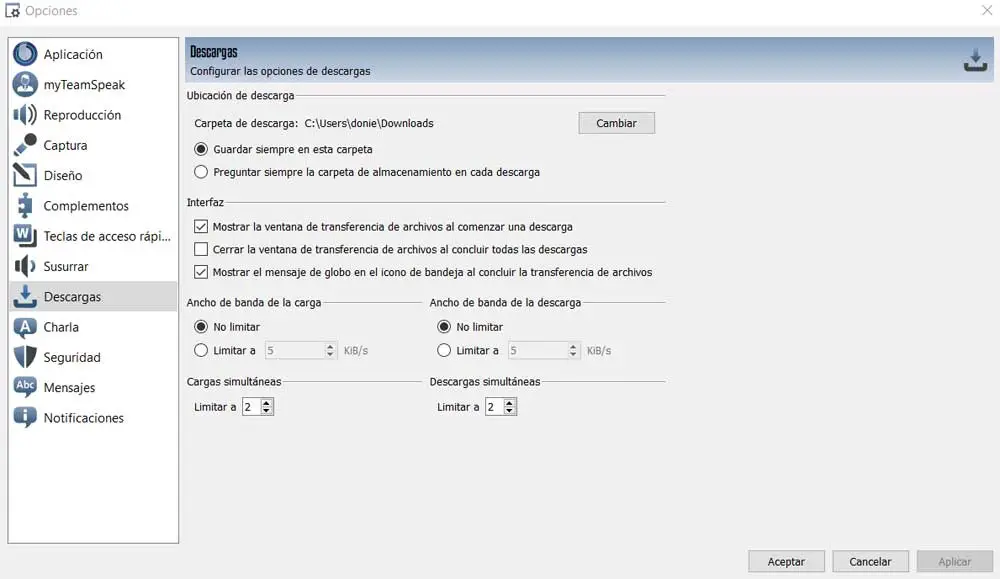 Tal y como su nombre nos deja entrever, en este apartado tenemos la posibilidad de especificar la ruta en la que deseamos guardar los contenidos bajados desde el cliente. De igual modo podemos limitar el ancho de banda total que el mismo podrá usar para estas, tanto en la subida como en la bajada de contenidos. Esto nos será de mucha ayuda si de manera paralela usamos Internet para otras tareas en ese mismo momento. También podemos indicar el número de bajadas o subidas simultáneas que podremos llevar a cabo.