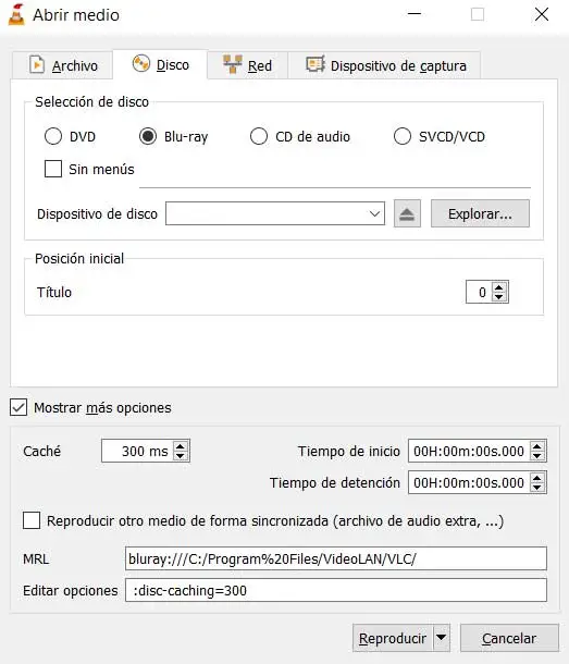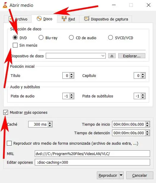 Ici, nous allons trouver une série d’options configurables, une fois que nous avons sélectionné le contenu en tant que tel dans Disk Device. Bien entendu, nous vous recommandons d’activer la case Afficher plus d’options en haut de la fenêtre. Cela nous permettra d’avoir plus de contrôle sur la tâche que nous devons effectuer à partir de VLC. Par conséquent, comme nous pouvons le voir de première main, le programme nous permet de spécifier si nous voulons ou non ajouter les menus du DVD .