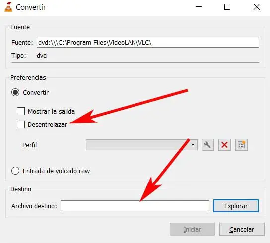 Pour terminer, nous cliquons à nouveau sur l’option Convertir dans la liste déroulante inférieure, où nous pouvons indiquer à VLC le fichier de sortie que nous allons générer.