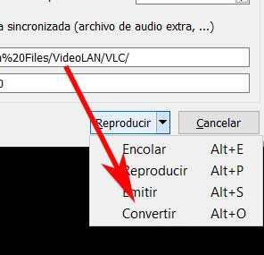 Une fois que nous avons tout cela en fonction de nos besoins, au lieu de cliquer sur le bouton Jouer dans le coin inférieur droit, nous affichons la liste avec la flèche. Par conséquent, nous avons opté pour l’option Convertir qui apparaît à l’écran. Cela nous amène à une nouvelle fenêtre de configuration . De là, nous pouvons configurer d’autres paramètres pour terminer ce processus. Ainsi, nous aurons la possibilité d’attribuer un nom au nouveau fichier que nous allons créer avec la copie numérique du ripping.