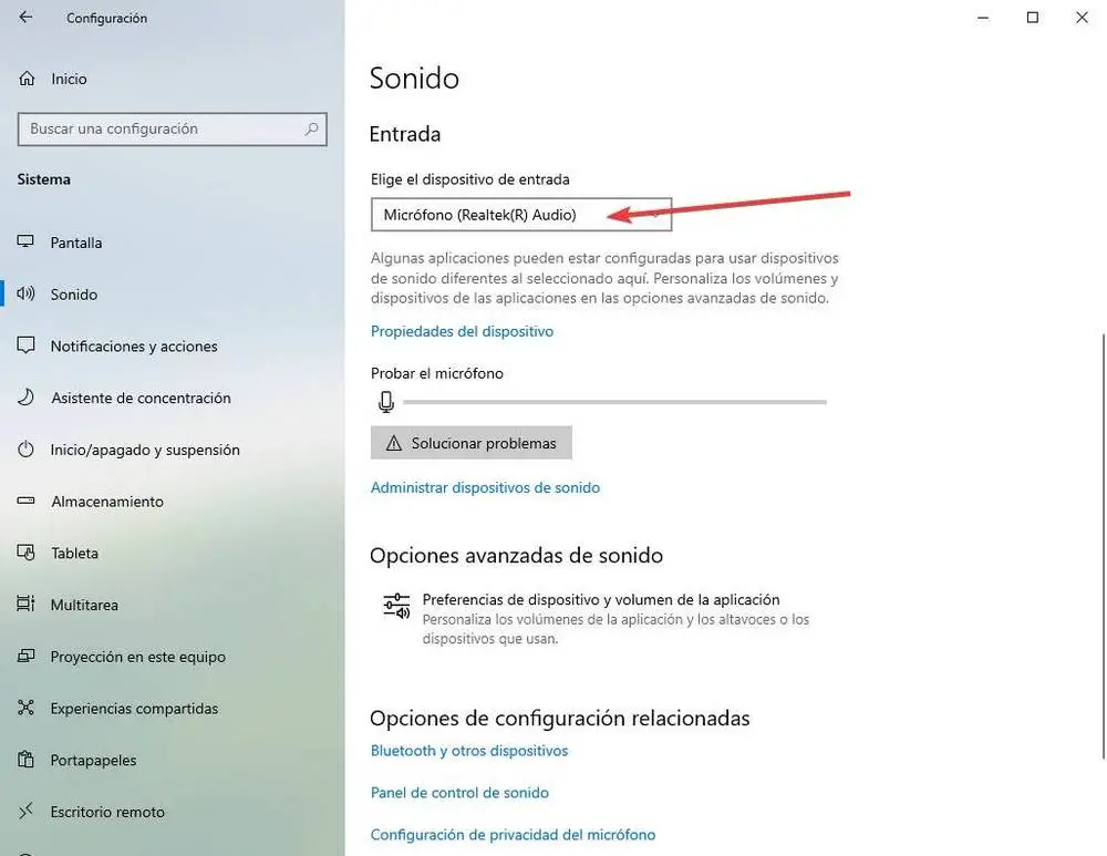 Tout d’abord, la première chose à faire est d’activer et de configurer le micro sous Windows 10. Pour ce faire, nous allons ouvrir le menu Configuration du système d’exploitation, et aller dans la section Système> Son. Ici, nous devrons localiser une section appelée «Entrée», à partir de laquelle nous pourrons contrôler les périphériques d’entrée audio (c’est-à-dire les microphones) que nous avons connectés au PC.