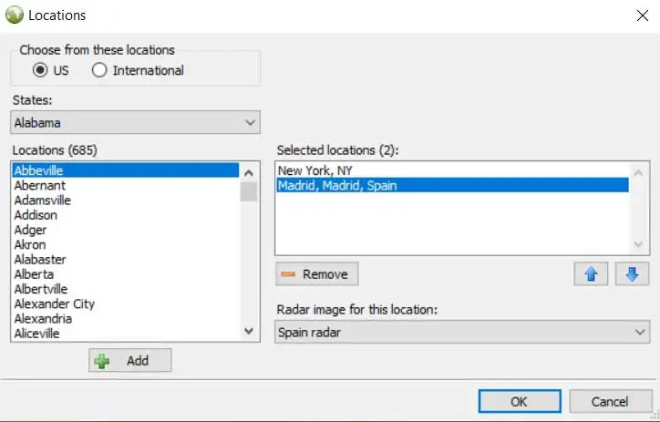 Comme vous pouvez l’imaginer, la première chose que nous devons faire ici est de spécifier la ou les zones pour lesquelles nous voulons recevoir des informations météorologiques . Ces régions sont séparées en onglets dans l’interface principale du programme. Pour cela et pour le reste des paramètres configurables, ce que nous faisons est de cliquer sur l’icône en forme de roue dentée sur l’interface du programme. Ici, la première chose à faire est d’aller dans la section intitulée Emplacements, où nous avons la possibilité d’ajouter ou d’éliminer des régions. Comme vous pouvez le voir de première main, nous trouvons ici un bon nombre de pays et de villes parmi lesquels choisir.