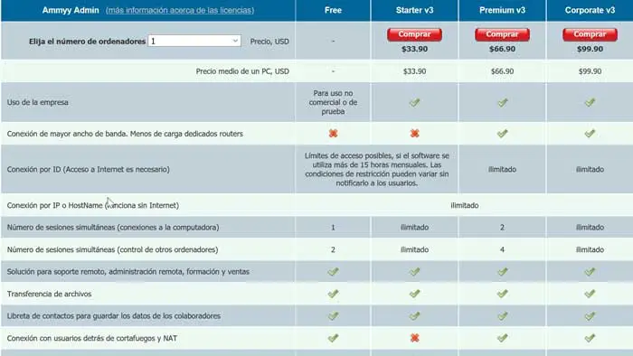 - Starter v3 : vous pouvez acheter 33,90 $ pour un ordinateur. Cette version permet son utilisation professionnelle et dispose d’un nombre illimité de sessions simultanées, avec tous les avantages déjà existants dans la version gratuite. De même, il a également une utilisation maximale de 15 heures par mois par connexion ID.