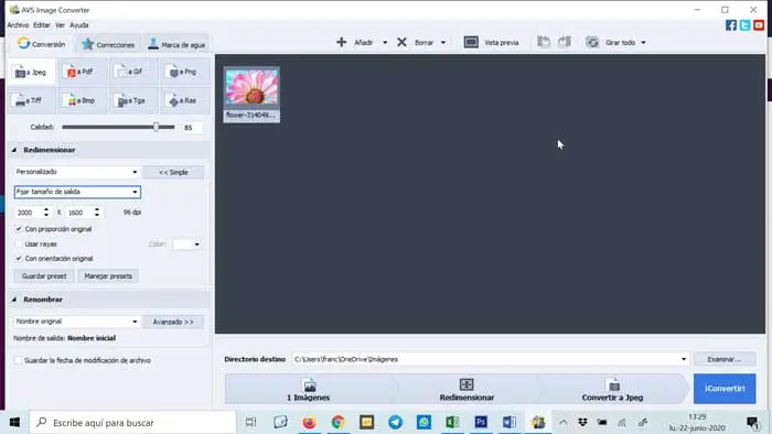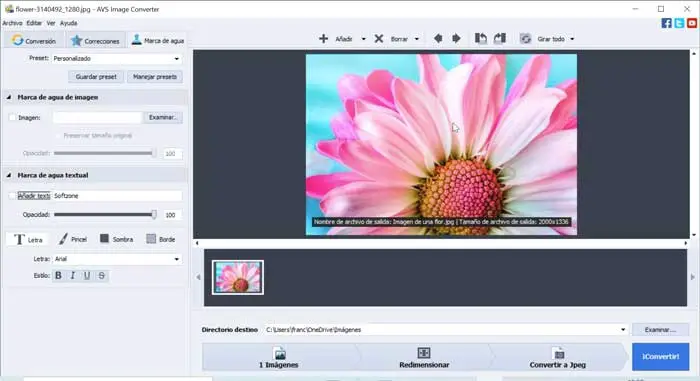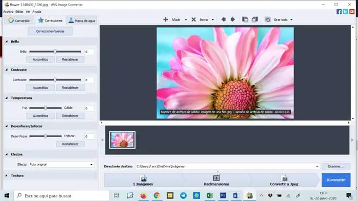 En haut à droite, nous trouvons trois onglets avec les principales fonctions de ce programme: Conversion, Corrections et Filigrane. Dans la partie centrale, nous trouvons le panneau principal où nous pouvons cliquer pour ajouter des fichiers ou les ajouter par glisser-déposer. En bas, nous trouvons le répertoire de destination , où seront enregistrés les fichiers résultant de notre conversion, ainsi que le bouton Convertir! que nous utiliserons pour convertir l’image une fois que nous aurons établi les paramètres appropriés.