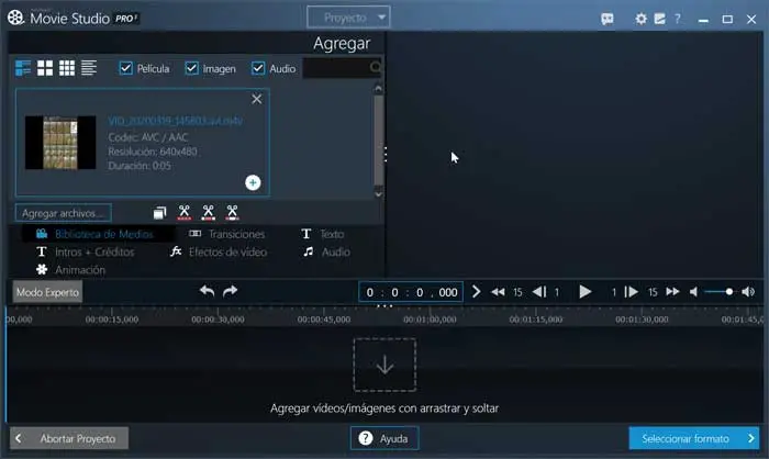 Juste en dessous du panneau Ajouter, en haut à gauche, nous avons divers boutons pour changer la vue de ce panneau entre Médiathèque, Transitions, Texte, Intros + Crédits, Effets vidéo, Audio et Animation. Juste en dessous, nous voyons un bouton pour passer en mode expert, au cas où nous voudrions continuer à éditer à partir de là.