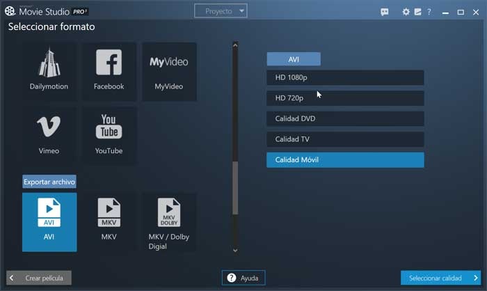 Si nous cliquons sur le bouton Sélectionner le format en bas à droite, nous passons à l’écran suivant. Ici, nous trouverons un menu pour choisir le format dans lequel nous voulons convertir notre vidéo, organisé par catégories. Nous pouvons choisir entre les appareils (Android, Apple, Huawei, HTC, etc.), les disques (Blu-Ray, DVD), le téléchargement (Facebook, MyVideo, YouTube, etc.) et les fichiers d’exportation (AVI, MKV, MP4, etc.). Peut-être manquons-nous la possibilité de convertir des fichiers au format HEVC ou WMV. Sur le côté droit cela nous donnera la possibilité de choisir la qualité désirée, en pouvant convertir, selon le format choisi, jusqu’à 4K .
