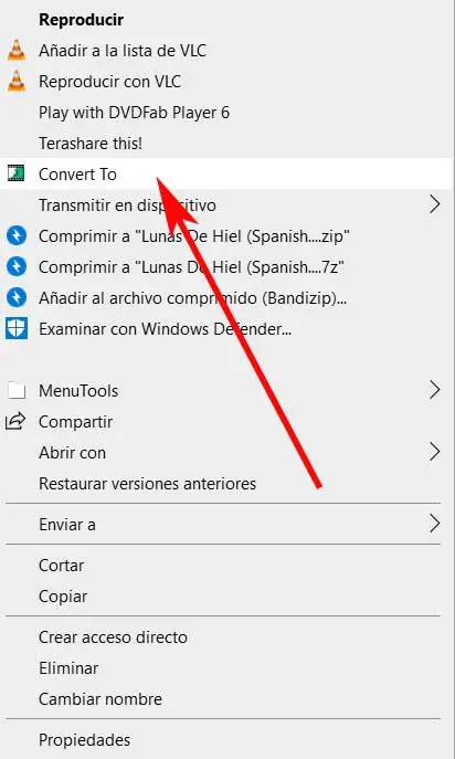 Il est également important de savoir que pour une utilisation facile, dBpoweramp Video Converter s’intègre dans l’Explorateur Windows lui-même. De cette façon, nous aurons la possibilité de cliquer sur le bouton droit de la souris pour l’utiliser. Ainsi, ce que nous devons faire avec une vidéo que nous voulons convertir est d’accéder à l’option de menu Convertir en. Ainsi, nous pouvons accéder directement au programme de conversion sans avoir à charger son interface au préalable, ce qui nous facilite grandement les choses.