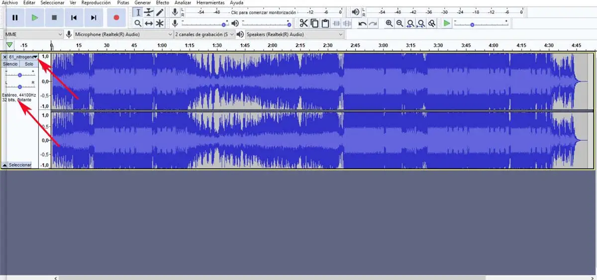 Par conséquent, comme beaucoup d’entre vous le savent peut-être déjà, ces fichiers audio auxquels nous nous référons sont généralement enregistrés en stéréo . Cela signifie en fait qu’il a été enregistré avec un canal sonore gauche et droit. Ainsi, lors de l’analyse de ce fichier MP3 via une application d’édition audio telle que le populaire Audacity , par exemple, nous verrions les deux canaux. En fait, il est normal que ceux-ci apparaissent comme des formes d’onde indépendantes.
