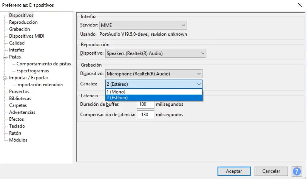 Bien sûr, dans le cas où nous utilisons le même Audacity pour enregistrer de l’audio et que nous voulons éviter ce processus, nous pouvons enregistrer en mono par défaut. Pour cela, nous allons dans le menu Edition / Préférences, et dans la section Périphérique , nous recherchons la section Canaux pour la définir en mono . Nous pouvons maintenant enregistrer les modifications afin qu’elles deviennent effectives dans de futurs projets avec nos lecteurs MP3.