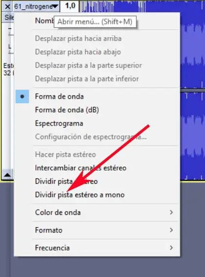 Ensuite, nous devons cliquer sur la flèche déroulante située en haut de la longueur d’onde. Dans le menu qui apparaîtra, nous sélectionnons l’option pour Diviser la piste stéréo en piste mono. Cela divise la piste en deux pistes distinctes, mais maintenant chaque piste indiquera qu’il s’agit d’une piste mono. Ainsi, nous aurons le travail terminé, nous pouvons donc supprimer l’un d’entre eux. Il ne reste plus qu’à exporter le nouveau fichier que nous avons créé, déjà en mono.