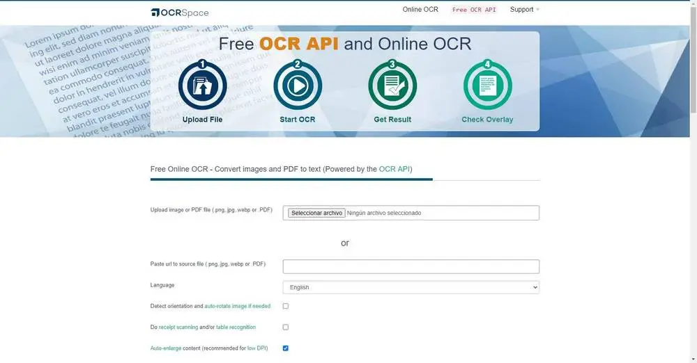 Nous trouvons quelque chose de similaire avec l’ OCR en ligne , même si dans ce cas, il s’agit d’une application Web que nous utilisons à partir du navigateur. Ici, la première chose que nous faisons après avoir téléchargé le PDF ou l’image avec le texte est de choisir la langue avec laquelle nous allons travailler. Il y en a beaucoup pris en charge par ce programme, donc il n’y aura pas de problème. De plus, le processus se déroule en quelques secondes avec un très bon taux de réussite des personnages. Il faut aussi savoir que cette application web peut être utilisée sans inscription et sans rien payer, même s’il est également vrai que nous avons d’autres solutions plus efficaces à notre disposition à cet égard.