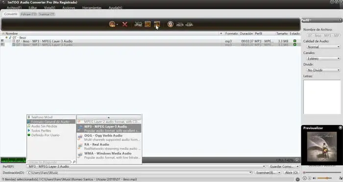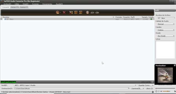 Lorsque nous exécutons ImTOO Audio Converter pour la première fois, son menu principal apparaît, entièrement en espagnol avec une interface très facile à utiliser. En haut, nous trouvons trois onglets avec les fonctions principales telles que «Convertir», «Extraire CD» et «Graver CD».