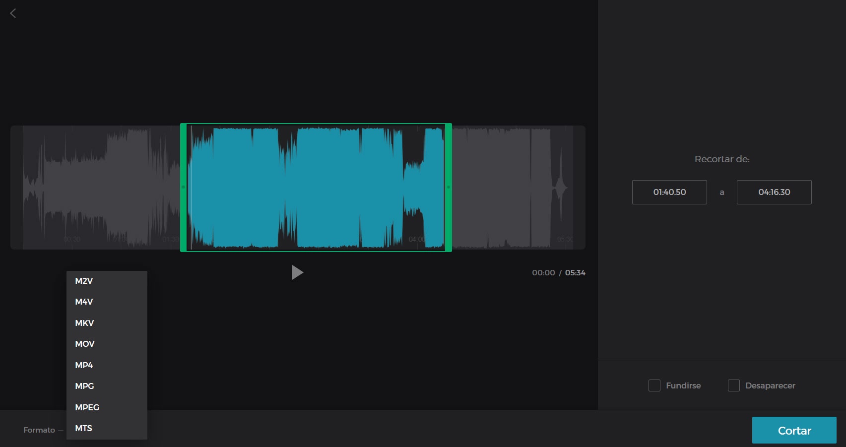 Ensuite, le fichier en question sera chargé sur la plateforme en tant que tel afin que nous puissions limiter directement la section que nous voulons extraire du signal audio affiché. C’est quelque chose que nous réalisons en faisant simplement glisser avec la souris le début et la fin de la section à couper du MP3 original. Également sur le côté droit de l’interface , nous verrons l’ exacte du temps où nous avons placé les deux limites afin d’être plus précis.