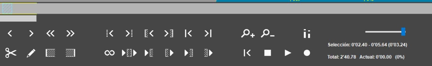 Par exemple, pour couper cette partie marquée, nous avons une icône représentée avec des ciseaux, ou deux loupes pour agrandir ou réduire la vue de la piste chargée. De la même manière, nous avons deux autres contrôles pour établir un point de départ et de fin de la marque que nous faisons dans la piste de fichier. Par conséquent, et comme nous pouvons le constater de première main, travailler avec ce programme spécifique ne pose aucune difficulté. Et par cela nous ne voulons pas dire qu’il est moins efficace dans sa tâche, au contraire, puisque nous obtiendrons de très bons résultats.