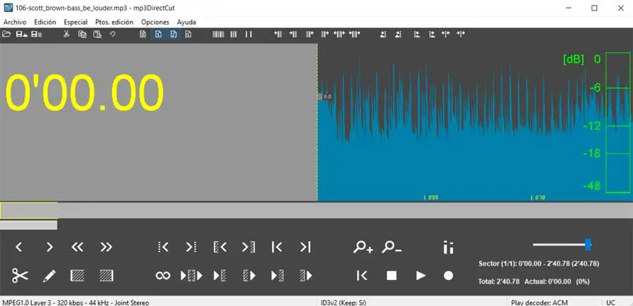 Une fois que nous avons chargé le fichier avec lequel nous allons travailler, la piste correspondante est créée dans l’interface principale de mp3DirectCut. De cette manière, en faisant simplement glisser le pointeur de la souris dessus, nous pourrons sélectionner une pièce, par exemple. Cela sera marqué comme la section avec laquelle nous allons opérer à ce moment-là, pour laquelle nous avons plusieurs raccourcis au bas de l’interface.