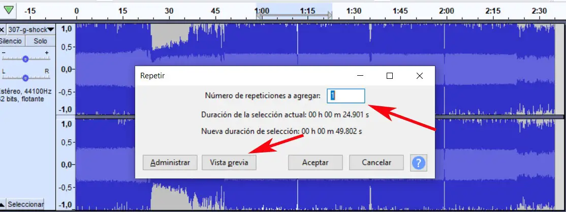 Une fois qu’elle a été chargée dans le programme, la forme d’onde correspondante apparaît à l’écran, donc pour sélectionner la section avec laquelle nous allons faire la boucle, il suffit de la marquer avec le pointeur de la souris . Une fois la sélection effectuée en tant que telle, nous allons dans le menu «Effet / répétition». Si tout d’abord nous voulons écouter la partie que nous avons marquée, cliquez sur le bouton «Aperçu».