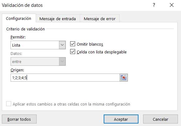 Donc, si nous avons besoin de créer une liste avec plusieurs éléments, ce qui est habituel, nous devrons les saisir ici, séparés par des points-virgules. De même, si nous voulons sélectionner une série de données qui fait déjà partie de la feuille elle-même, cliquez sur le bouton à droite de cette boîte de dialogue . Cela nous ramènera à l’interface principale où nous pouvons marquer à la souris les cellules à partir desquelles nous allons extraire les données Excel.