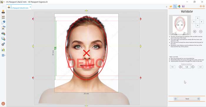 Ce logiciel professionnel complet intègre un assistant qui nous guidera à travers quatre étapes simples pour perfectionner les photos du document. Il veillera à tout moment à nous donner des conseils sur la façon de prendre une photo comme le fond, l’expression facile ou la vue de la tête pour obtenir une photo optimale pour notre document officiel. De plus, il est certifié ISO / CEI 19794-5 sur la base des normes géométriques de l’Organisation de l’aviation civile internationale (OACI).