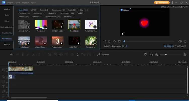 L’onglet suivant, «Animations», nous offre la possibilité de fournir à notre vidéo différentes animations organisées par catégories. Enfin, nous avons la section «Musique», qui nous aidera à fournir différents effets sonores à notre création. Sur le côté droit de l’écran, nous pouvons voir à tout moment un aperçu du résultat de notre création.