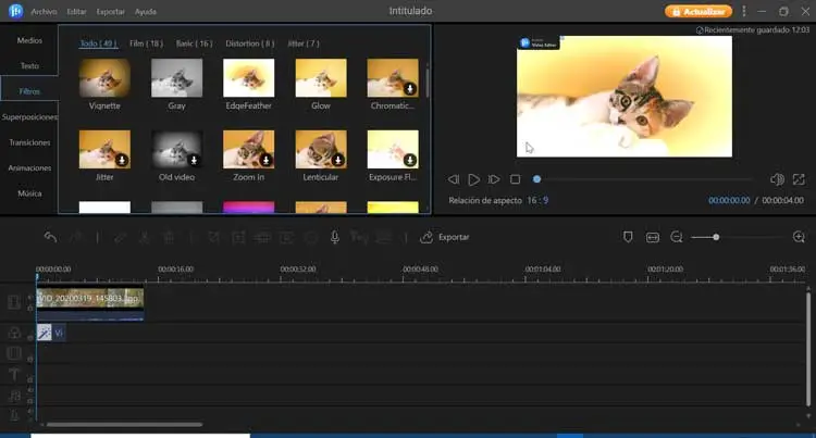 On retrouve également l’onglet «Filtres» où l’on peut ajouter une touche de couleur spéciale à notre vidéo, à la fois avec les filtres qu’elle intègre et avec la possibilité de télécharger une autre grande variété. Depuis l’onglet «Superpositions», nous pouvons ajouter des superpositions à notre vidéo pour lui donner une touche originale. Vous ne pouvez pas manquer l’onglet «Transitions», qui sera très utile pour, par exemple, créer une vidéo avec différentes photos. De là, nous pouvons sélectionner la manière dont nous voulons que les transitions soient effectuées entre l’une et l’autre.