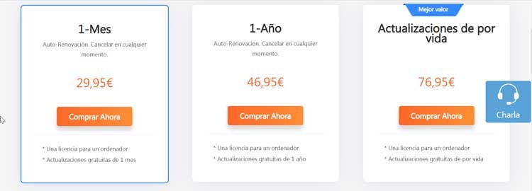 - 1 an : cela nous permet également d’obtenir votre licence annuellement, avec auto-renouvellement année après année, pouvant résilier à tout moment. Comprend des mises à jour gratuites tout au long de la période et la licence est valable pour un ordinateur. Son prix est de 46,95 euros / an .