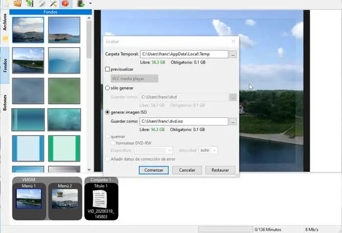 Une fois le processus de création et d’édition des menus terminé, nous n’aurions plus qu’à enregistrer le résultat sur un DVD . Pour ce faire, il suffit de cliquer sur le bouton de gravure de la barre d’outils et une fenêtre apparaîtra. Il nous donne la possibilité de prévisualiser le résultat à l’aide d’un lecteur comme VLC, de générer un fichier, de créer une image ISO ou de graver directement avec notre lecteur DVD. Une fois sélectionné, nous n’aurons plus qu’à cliquer sur le bouton Démarrer.