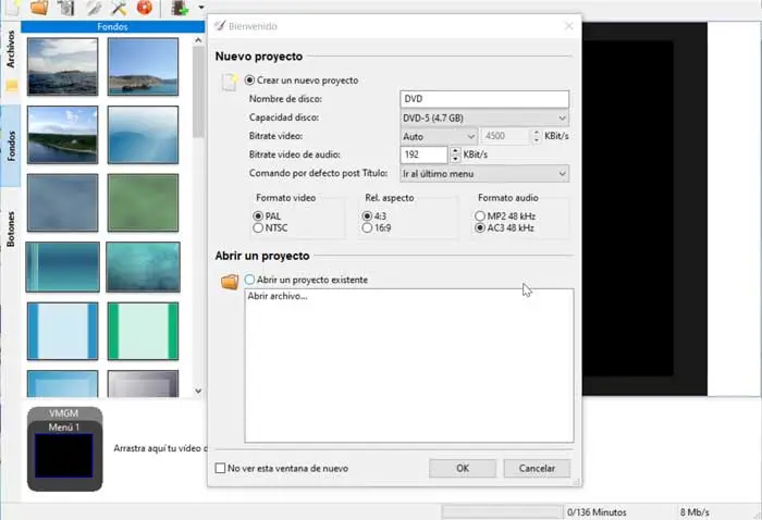 Au démarrage de DVDStyler, le menu principal apparaîtra avec une fenêtre de bienvenue, où il nous offre la possibilité de configurer et de créer un nouveau projet . De là, nous pouvons le nommer, choisir le format vidéo, le rapport hauteur / largeur et le format audio. Ou, aussi, cela nous offre la possibilité d’ouvrir un projet existant. En bas à gauche, il y a une boîte que nous pouvons vérifier si nous ne voulons pas qu’elle soit affichée à chaque fois que nous démarrons le programme.