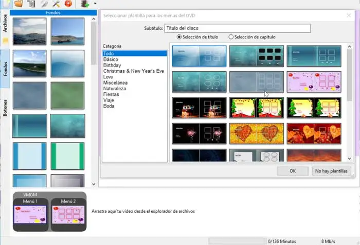 Si nous allons créer un nouveau projet, ajustez les paramètres souhaités et cliquez sur Ok, pour aller à la fenêtre suivante. Dans celui-ci, nous pouvons sélectionner le modèle pour les menus du DVD . Nous trouverons ici différentes catégories prédéfinies pour toutes sortes d’occasions. Ainsi nous aurons la catégorie Anniversaire, Noël, Amour, Nature, Fêtes, Voyage ou Mariage. Une fois que nous avons sélectionné l’arrière-plan souhaité, appuyez sur OK et le menu principal du programme apparaîtra.