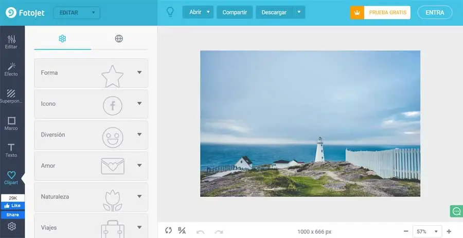 Cela nous permettra de faire des ajustements aux images, à la fois basiques et plus avancés. La meilleure partie de tout cela est que, quelle que soit la fonction choisie, nous obtiendrons intuitivement des résultats très frappants et spectaculaires. Même ici, nous avons la possibilité d’ajouter des cadres à des photos, des textes , d’appliquer des effets numériques, etc. En fait, nous avons même une série de cliparts prédéfinis que nous pouvons ajouter à nos projets à ce moment-là.