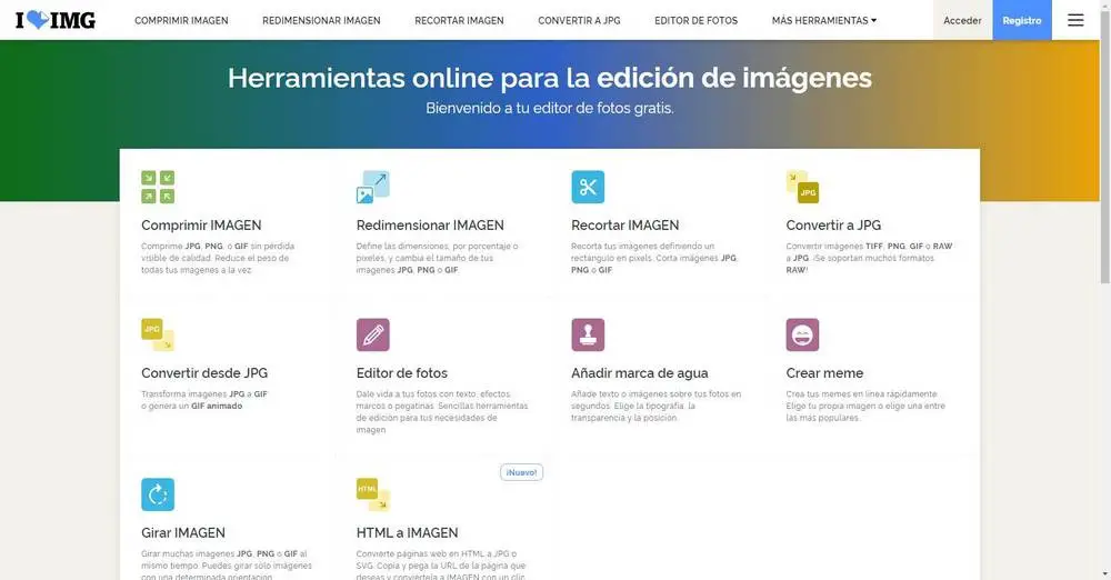 Nous pouvons accéder aux outils d’édition de photos I love IMG à partir d’ ici . Ce site est gratuit, bien que nous ayons un plan «Premium», qui coûte 6 euros par mois, qui offre plus de fonctions et d’outils.