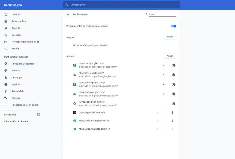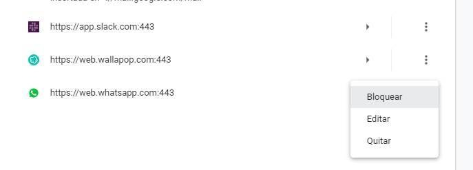 Beaucoup sont sûrement dignes de confiance. Par exemple, WhatsApp, Wallapop ou les applications Google Docs. Cependant, il est très probable que nous ayons un site Web inconnu, ce qui sera responsable des notifications de virus sur notre PC. Par conséquent, ce que nous devons faire est de cliquer sur l’icône avec les trois points et nous choisirons l’option «Bloquer» ou «Supprimer» pour que ledit site Web cesse de nous montrer des avis sur le PC.