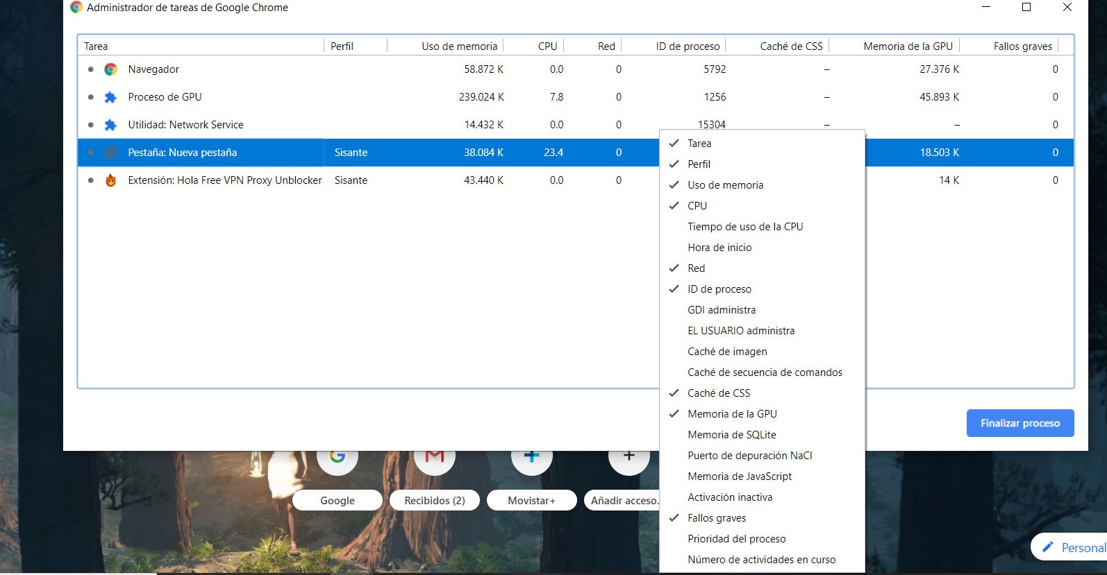 Pour cela, nous pouvons utiliser un outil puissant qui est inclus dans le logiciel lui-même et que le temps s’est amélioré ostensiblement, nous nous référons au gestionnaire de tâches du navigateur lui-même. C’est une fonction qui nous permet de contrôler de nombreux aspects internes du programme, ce qui nous aidera. De cette façon, nous pouvons contrôler ce qui consomme le plus de ressources , le processus de chaque section, l’utilisation du GPU , etc. Il est vrai qu’au départ, les informations que nous allons voir ici sont quelque peu limitées, mais nous pouvons les augmenter.