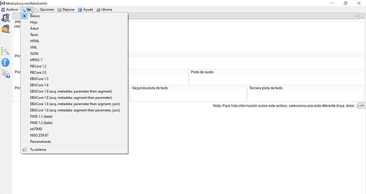 MediaInfo dispose d’une large gamme d’affichage, puisque nous sommes dans le «Basic». Pour obtenir plus d’informations sur le fichier que nous avons choisi, nous pouvons sélectionner une vue différente dans la section «Affichage» . Appuyez sur pour afficher un menu large avec différentes options d’affichage telles que «Feuille», «Arbre», «Texte», «HTML», «XML», etc. De cette façon, nous pouvons voir toutes les données de nos fichiers de la manière qui nous semble la plus confortable.