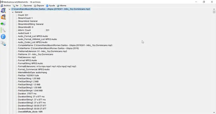 C’est une application open source avec laquelle nous pouvons voir les informations techniques de tous nos fichiers audio, image et vidéo, étant compatible avec une grande variété de formats, parmi lesquels les plus populaires. Nous pouvons charger les fichiers individuellement ou en affichant simultanément toutes les propriétés de chaque fichier par ligne. Nous pouvons télécharger MediaInfoXP gratuitement à partir de son site Web.