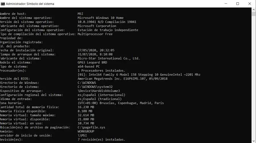 Cela nous renverra en détail le jour et l’heure où nous avons installé la dernière mise à jour des fonctionnalités de Windows 10 . Mais bien sûr, ce n’est pas la seule chose que nous allons obtenir de la commande Systeminfo. En supposant que ce dont nous avons besoin est de voir tout ce que propose cette commande informative, voyons comment y parvenir. Pour ce faire, à partir de cette même fenêtre d’ invite de commandes , nous tapons la commande telle quelle, c’est-à-dire systeminfo. Cela nous rendra ce que nous recherchons vraiment ici.