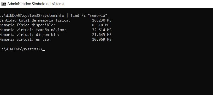 Comme nous l’avons vu précédemment avec la section sur la dernière mise à jour de Windows , il faut savoir qu’il s’agit d’une commande qui nous permet de filtrer les données qu’elle va nous montrer. Pour cela, il suffit que nous utilisions une structure similaire à celle que nous avons vue précédemment, mais en modifiant le mot-clé que nous incluons entre guillemets. A titre d’exemple, si nous ne sommes intéressés que par la visualisation des données relatives à la mémoire installée dans l’équipement, la commande à utiliser dans ce cas serait la suivante: systeminfo | find / i «mémoire».