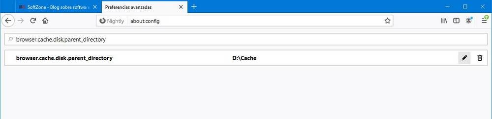Une fois cela fait, nous redémarrons le navigateur et, lorsqu’il sera rouvert, le nouveau répertoire sera configuré comme chemin par défaut pour enregistrer le cache. Si nous voulons que Firefox utilise à nouveau le répertoire de cache par défaut, nous devons simplement rechercher à nouveau cette option et la supprimer de l’icône de la corbeille.