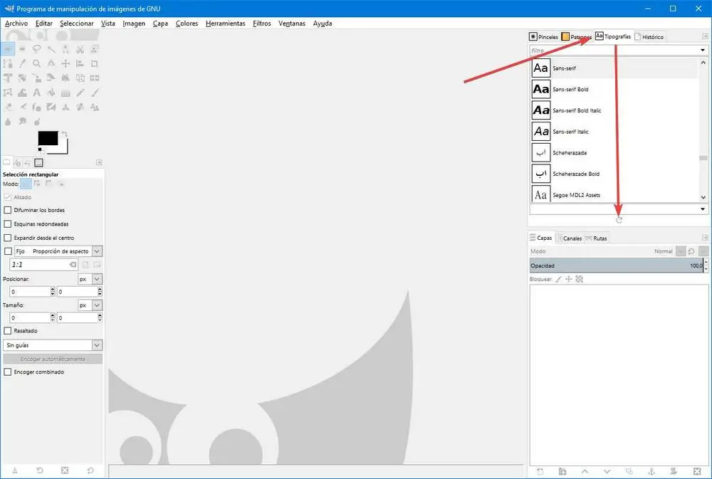 Si nous avons essayé d’installer une police différente, GIMP peut ne pas la reconnaître par défaut. Dans ce cas, il faut essayer de le copier directement dans le dossier sources du programme pour essayer de le faire reconnaître, bien que ce ne soit pas assuré.