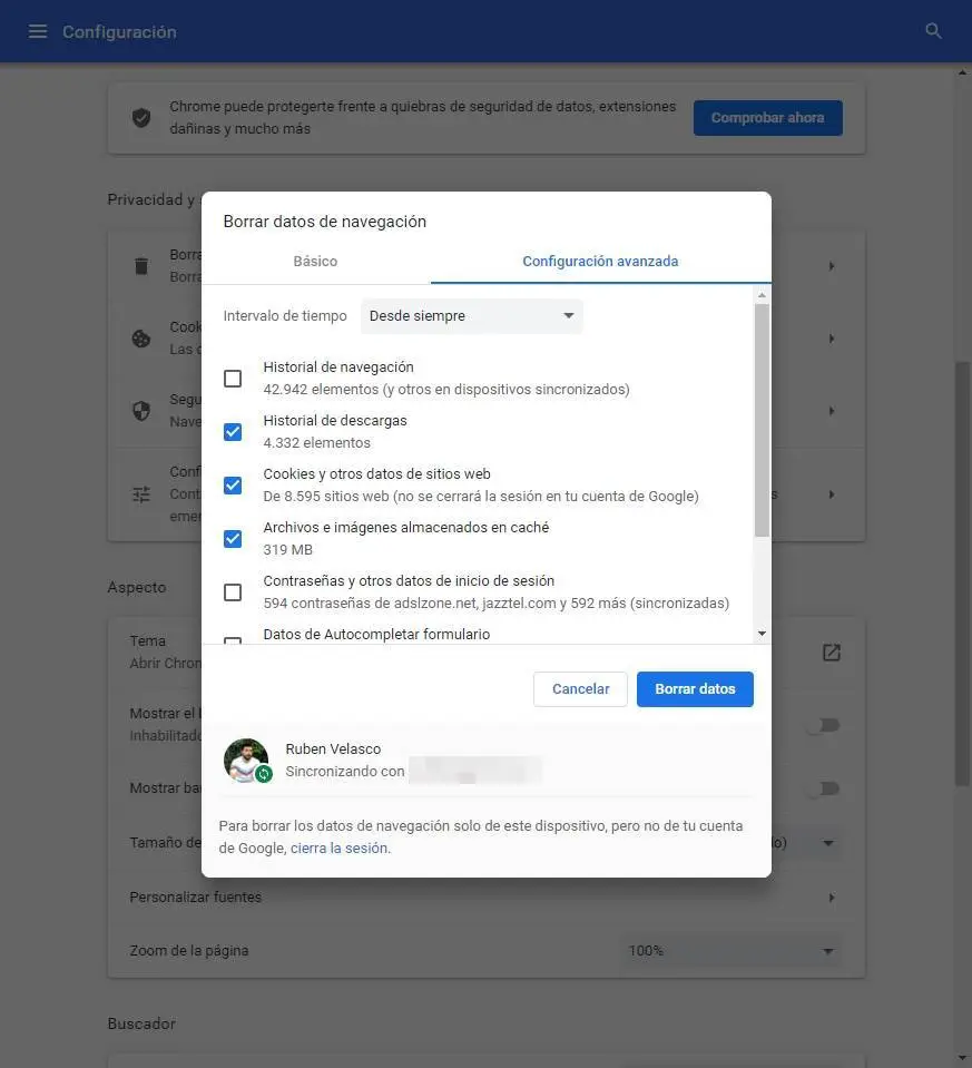 Par conséquent, si nous rencontrons des problèmes de tout type, nous devons effacer tout le cache et tous les fichiers temporaires du navigateur pour éviter que ceux-ci n’influencent le bon fonctionnement de celui-ci.