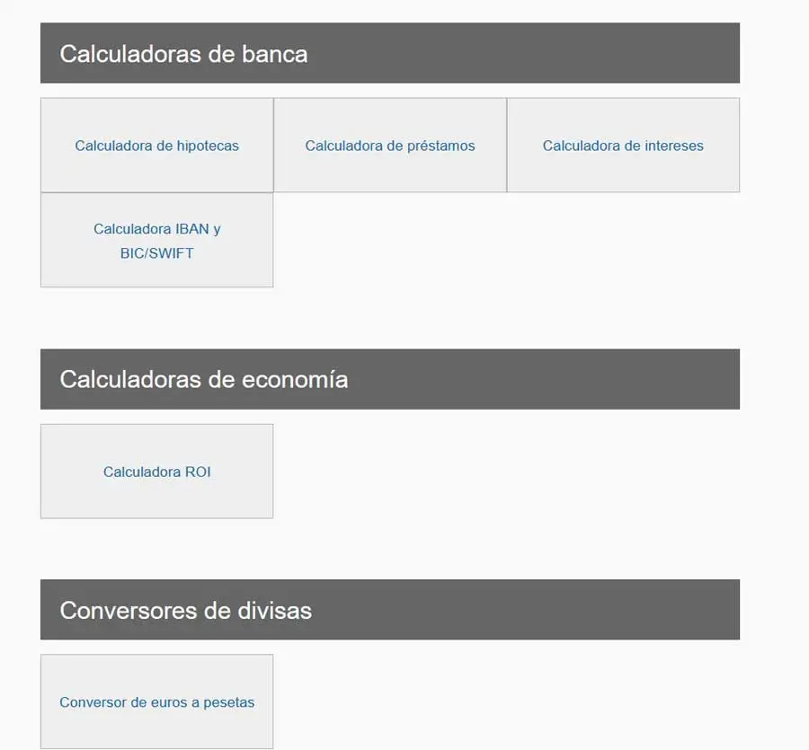 Lorsque nous parlons de calculatrices en ligne spéciales, nous parlons de calculatrices elles-mêmes, mais elles nous aident dans d’autres tâches un peu plus spécifiques. Par exemple, nous trouvons ici Calcuonline, une proposition qui nous permet d’effectuer des calculs liés à la banque, à l’économie, aux devises, aux finances ou à l’analyse mathématique , entre autres. De plus, chacune des catégories exposées est divisée en plusieurs sections.