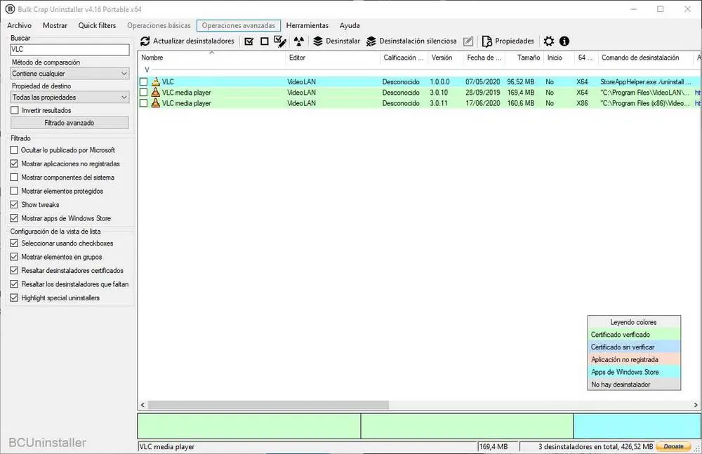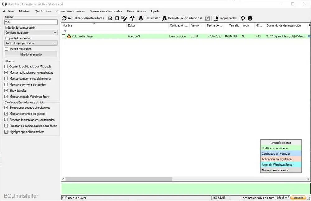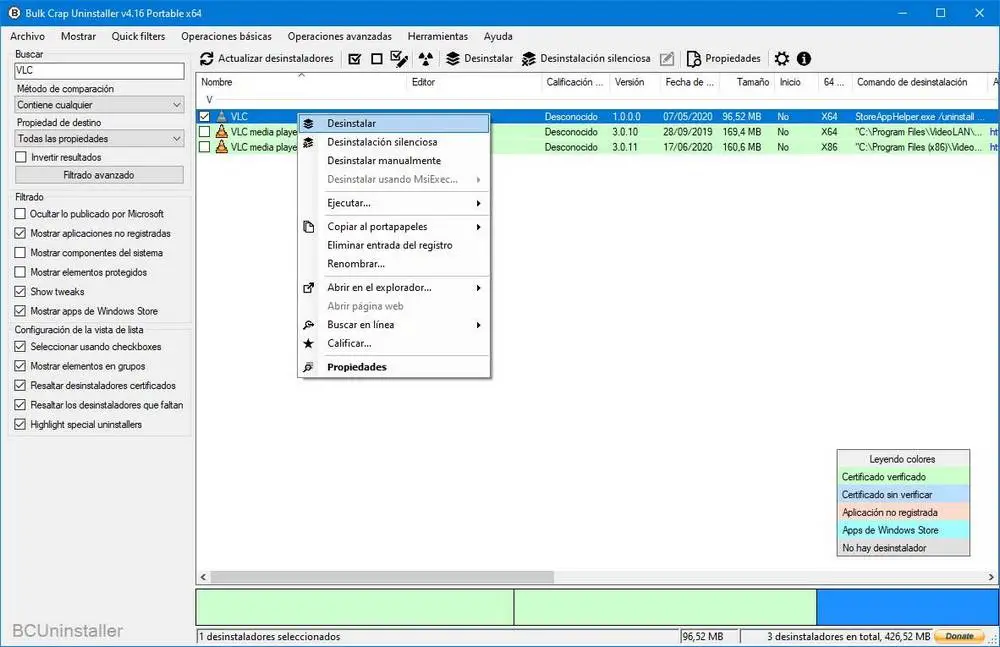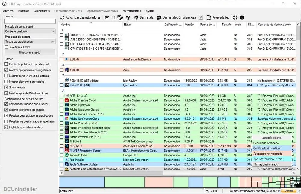 Dans celui-ci, nous pourrons voir une liste de tous les programmes que nous avons installés sur le PC. Cette liste aura une légende de couleur qui nous permettra de connaître le type de programme de désinstallation de chaque programme. Les verts, par exemple, sont des programmes de désinstallation vérifiés, les bleus foncés sont ceux qui ont un certificat non vérifié, les roses sont une application non enregistrée dans le système, les bleu clair sont des programmes du Microsoft Store et les gris clair sont tous ces programmes qui n’ont pas de programme de désinstallation.