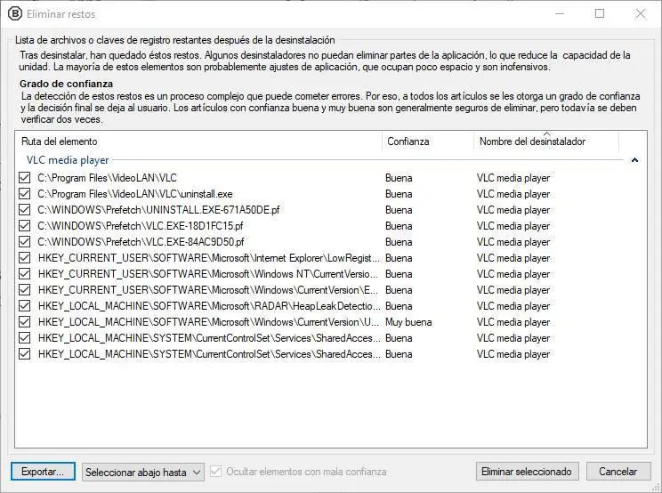 Et s’il y en a, nous pouvons voir un résumé avec tous ces restes. Nous pouvons cocher les cases de tout ce que nous voulons supprimer, ou décocher les cases de tout élément que nous ne voulons pas désinstaller.