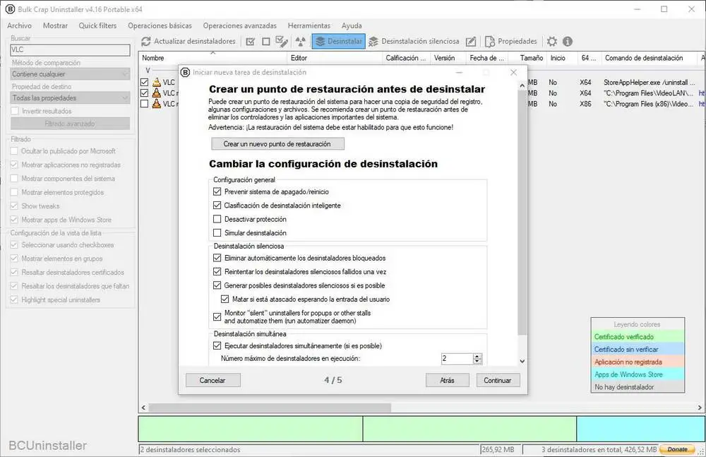 Dans l’étape suivante, le programme vérifiera si nous avons des programmes ouverts que nous devons fermer avant de pouvoir continuer la désinstallation, puis il nous offrira la possibilité de créer un point de restauration et de configurer certains paramètres pour ajuster et affinez la suppression du programme.