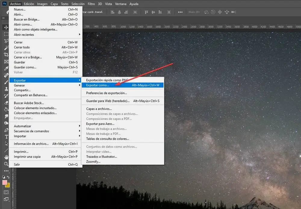 Esto podemos hacerlo directamente desde el propio Photoshop. En Camera RAW, hacemos clic sobre «Abrir» para cargar la imagen dentro del programa de Adobe. Una vez abierta la foto, nos desplazamos hasta el menú Archivo > Exportar > Exportar como, y podremos ver una ventana donde elegir cómo queremos guardar la imagen.