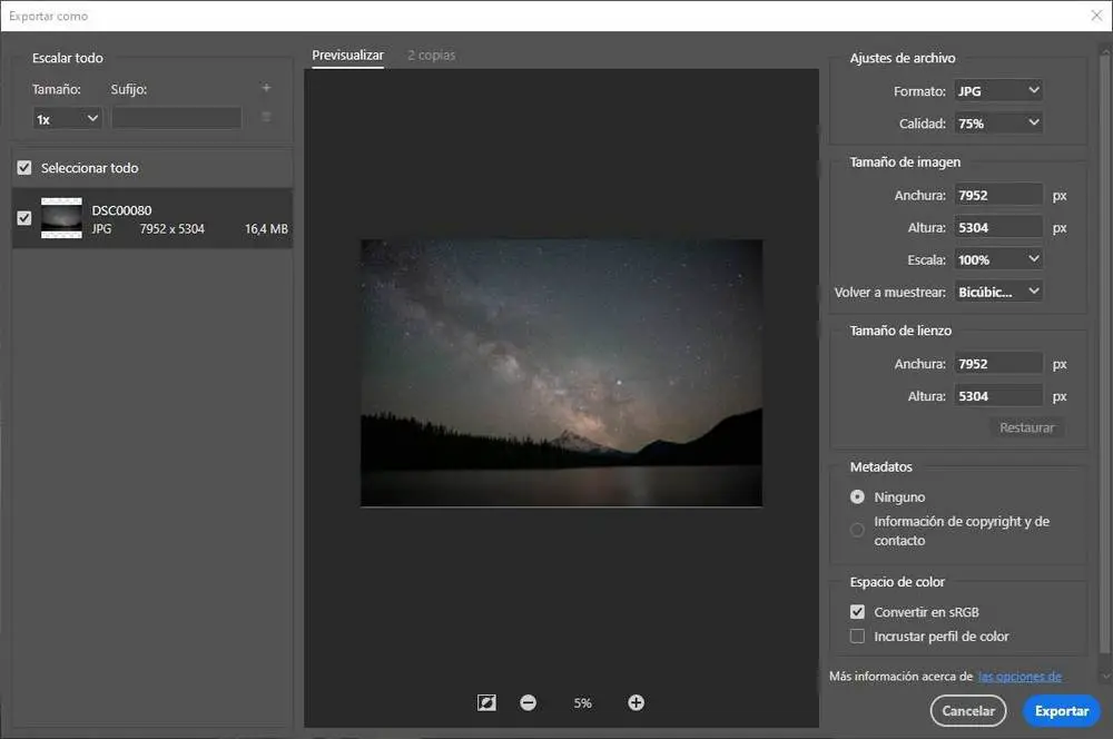 Elegiremos el formato que queramos (JPEG, por ejemplo), la compresión, el tamaño de la imagen, etc. Todos los valores que queramos. A medida que vayamos seleccionando opciones podremos ver que el tamaño de la foto va cambiando.