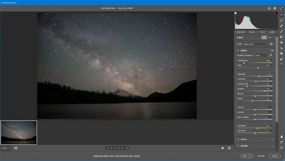 La interfaz del Camera Raw es muy sencilla. La mayor parte de esta está reservada para la vista previa de la imagen, mientras que a la derecha es donde entraremos todas las opciones de edición y retoque. Por supuesto, los cambios que hagamos en la foto serán no destructivos, por lo que, al tener los valores en crudo, podremos volver a modificarlos, o volver a los originales, en cualquier momento.